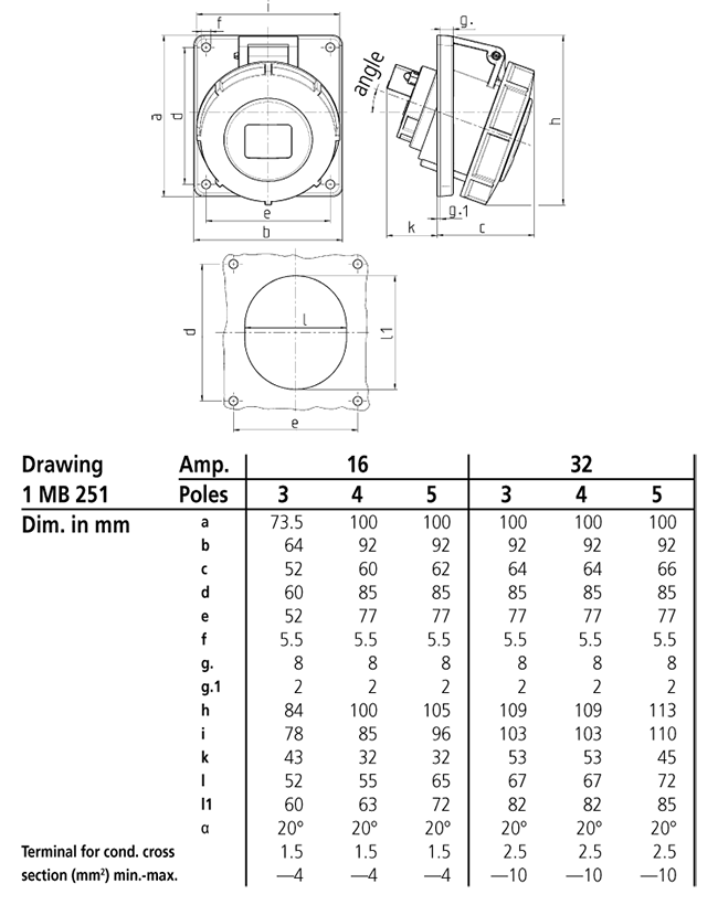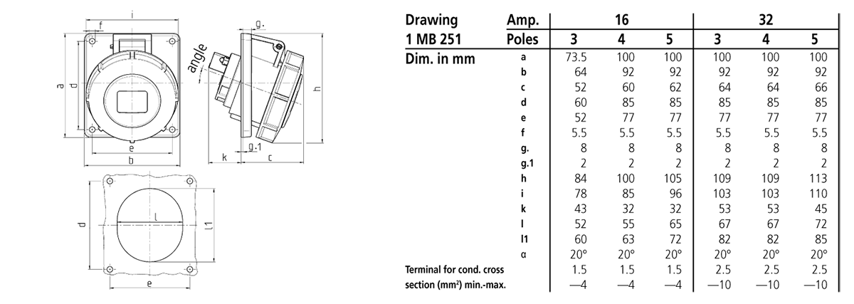 Ổ cắm âm bảng MENNEKES – dạng nghiêng 20° – Drawing 1 MB 251 – IP67
