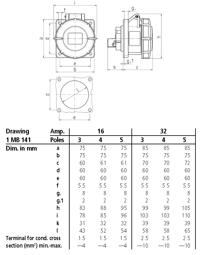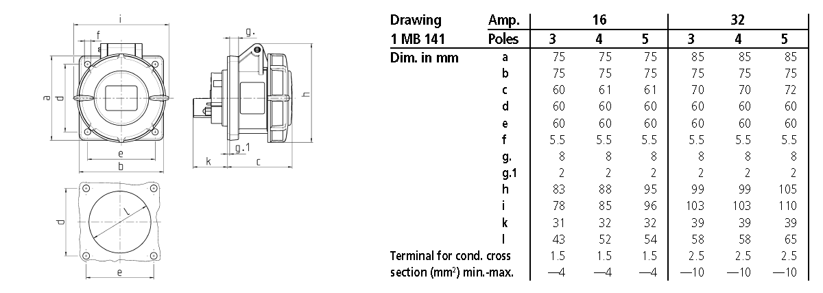 Trang chủ > Sản phẩm > Ổ cắm gắn tủ > Ổ cắm âm bảng MENNEKES – dạng thẳng – Drawing 1 MB 141 – IP67