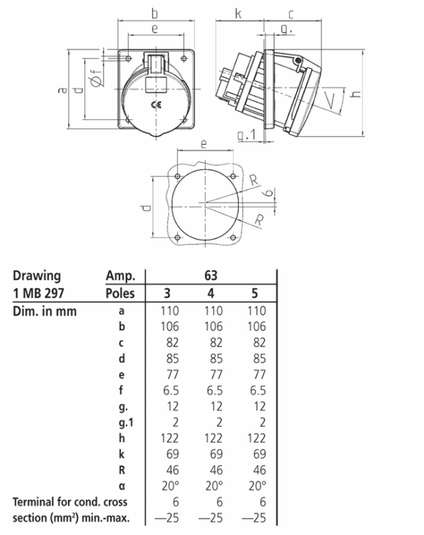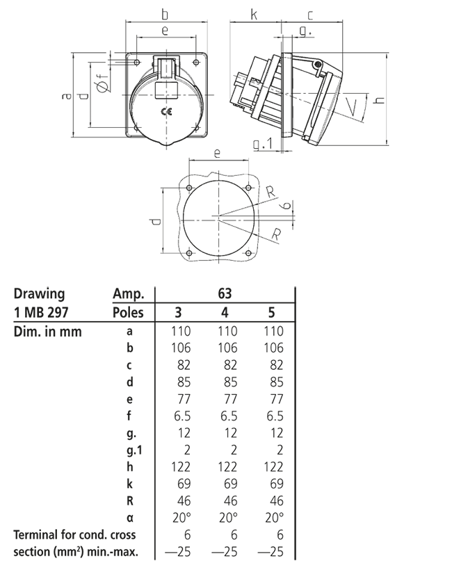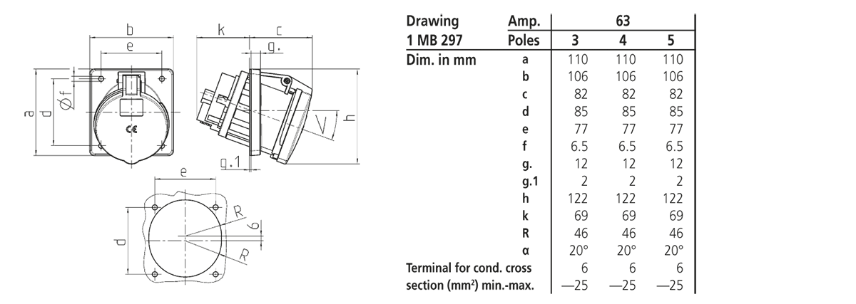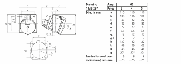 Trang chủ > Sản phẩm > Ổ cắm gắn tủ > Ổ cắm âm bảng MENNEKES – X-CONTACT – dạng nghiêng 20° – Drawing 1 MB 297 – IP44