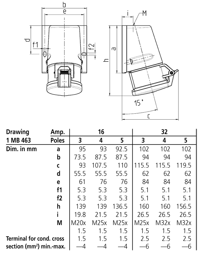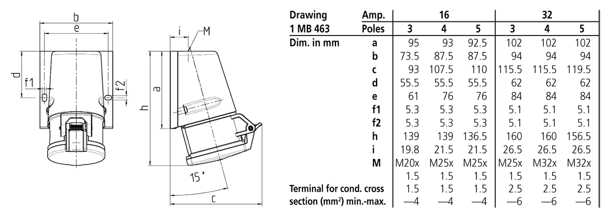 Ổ cắm gắn tường MENNEKES – TwinCONTACT – Drawing 1 MB 463 – IP44