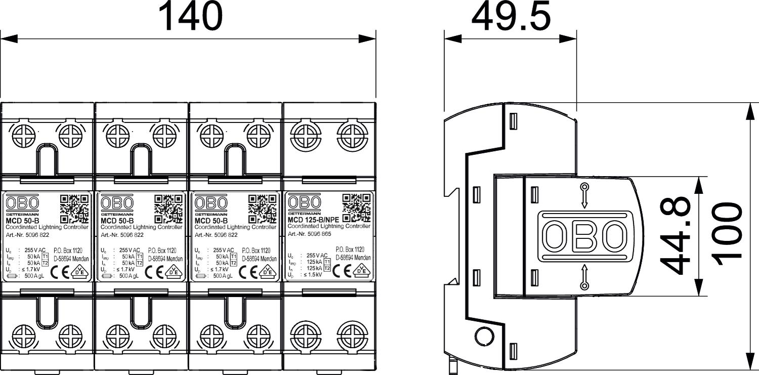 3x MCD 50-B: Thiết bị chống sét phối hợp Type 1+2 theo tiêu chuẩn EN 61643-11.
